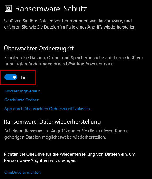 Mit der Funktion des „überwachten Ordnerzugriffs“ kann man Windows 10 auf recht effektive Art und Weise vor sogenannter Ransomware (also erpresserischer Malware) schützen.