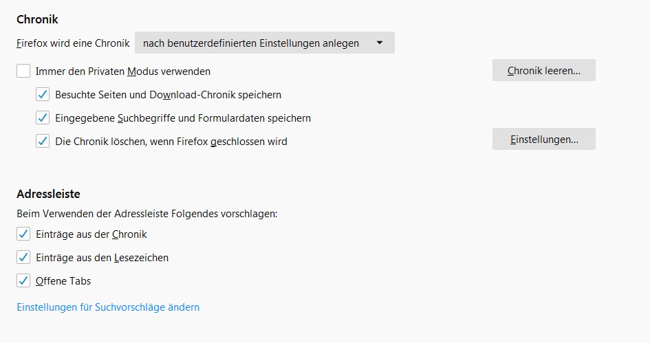 Nun stellen Sie nun, wie aus dem kommenden Bild hervorgeht, die Einstellungen für Chronik und Adressleiste ein.