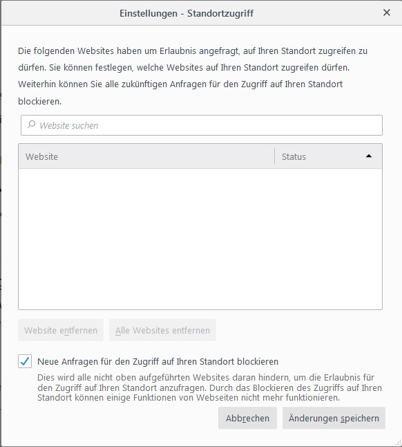 (Empfehlung: Bei den Einstellungen für den Zugriff auf Ihren Standort setzen sie bitte sofort das Häkchen auf „Neue Anfragen für den Zugriff auf Ihren Standort blockieren“ – Es geht niemanden etwas an, wo Sie sich gerade befinden!)