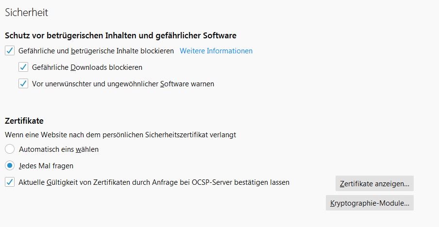 Bitte stellen Sie hier unbedingt ein, dass „wenn eine Website nach dem persönlichen Sicherheitszertifikat verlangt„, dieses abgefragt werden soll. Wählen Sie auf GAR KEINEN FALL den Punkt „Automatisch eins wählen“ und setzen sie anschließend noch das Häkchen bei „Aktuelle Gültigkeit von Zertifikaten durch Anfrage bei OCSP-Server bestätigen lassen„