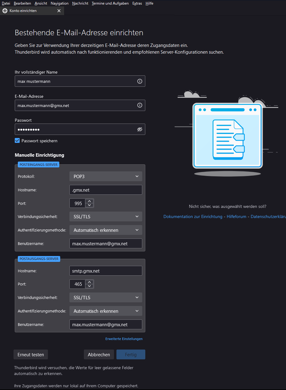 Dort trägt man seinen Benutzernamen und die bereits bestehende Mailadresse, sowie sein Passwort ein und gibt dann weiter unten bei Posteingangsserver und Postausgangsserver folgende Daten ein: